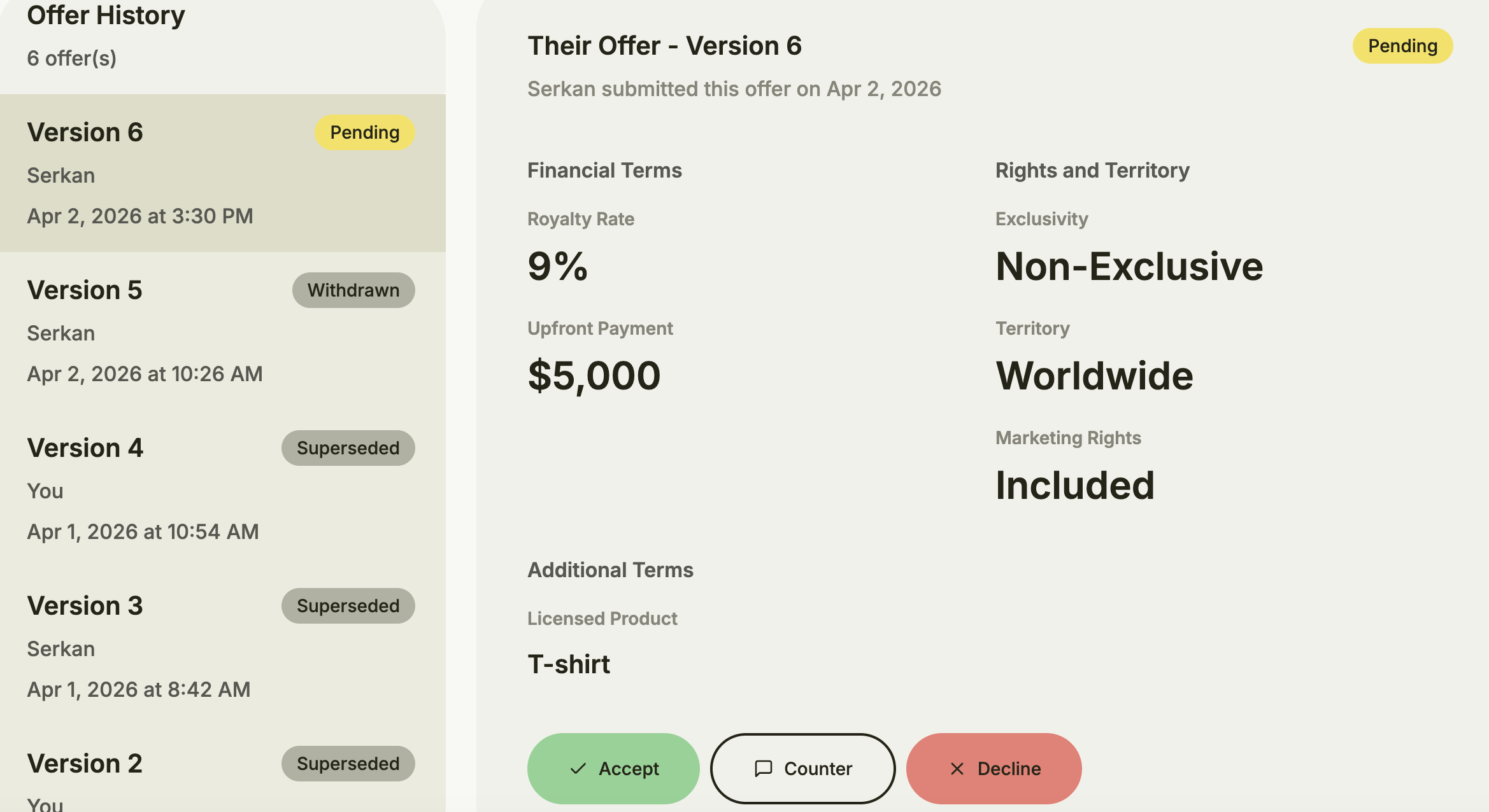 Go from brief to signed terms in a single shared workspace. No more scattered email threads or lost attachments.
